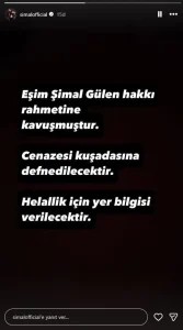 Şimal’in ölüm haberini, eşi Necati Arıcı sosyal medya hesabı üzerinden duyurdu. Arıcı paylaşımında, “Eşim Şimal Gülen hakkın rahmetine kavuşmuştur. Cenazesi Kuşadası’na defnedilecektir. Helallik için yer bilgisi verilecektir.” ifadelerine yer verdi.